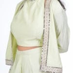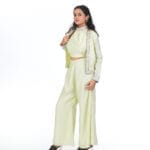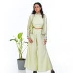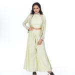 The halter neck Pista colored cord -set is a trendy and refreshing ensemble .perfect for fashion forward women. The soft Pista green hue adds a soothing and modern touch to the outfit.