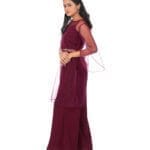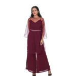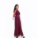 The maroon color cord -set is a bold and stylish ensemble, perfect for making a striking impression. The rich maroon hue adds a deep, luxurious feel to the outfit,while the matching top and pants offer a sleek,coordinated look that combines comfort and elegance.